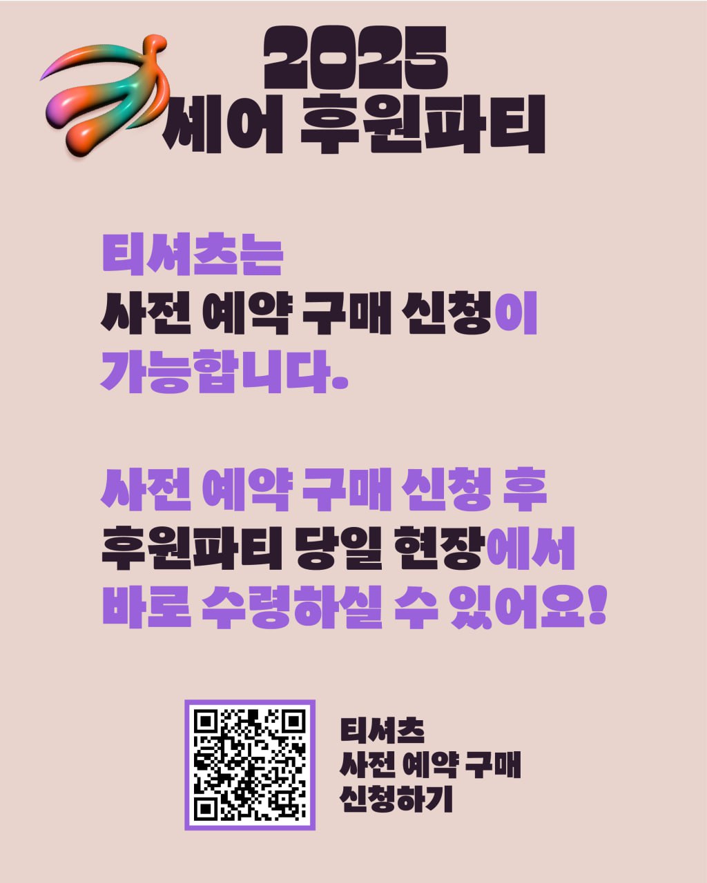 👉티셔츠는 사전 예약 구매 신청을 하실 수 있어요. 사전 예약 구매 신청 후 후원파티 당일 현장에서 바로 수령하실 수 있습니다.