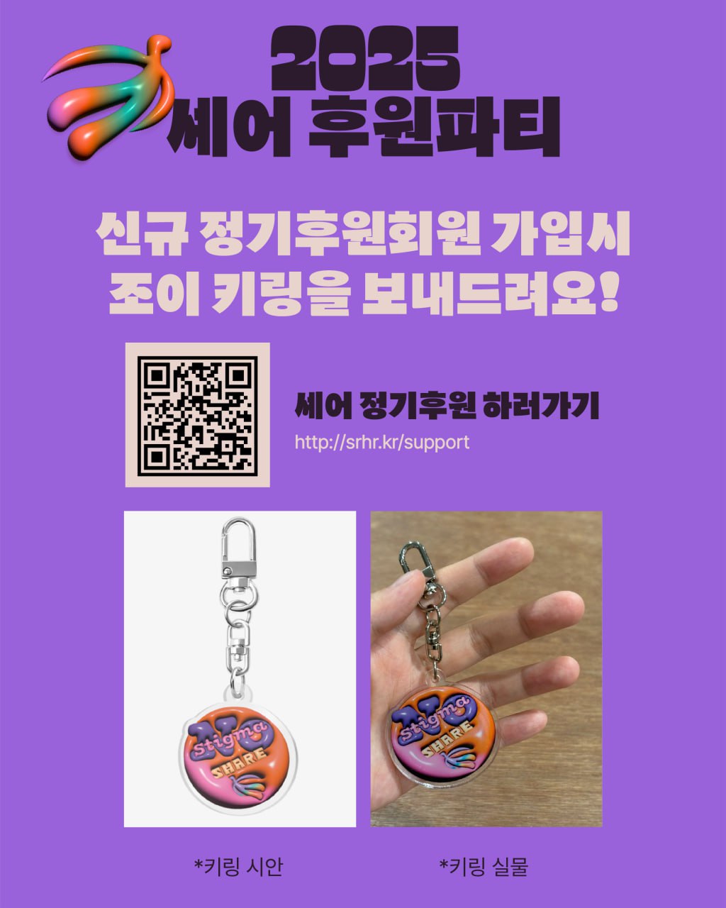낙인 대신 권리를, 차별이 아닌 연결을, 부정의에 함께 맞서는 긍지를 위해 활동하는 '셰어'와 정기후원으로 함께해 주세요.