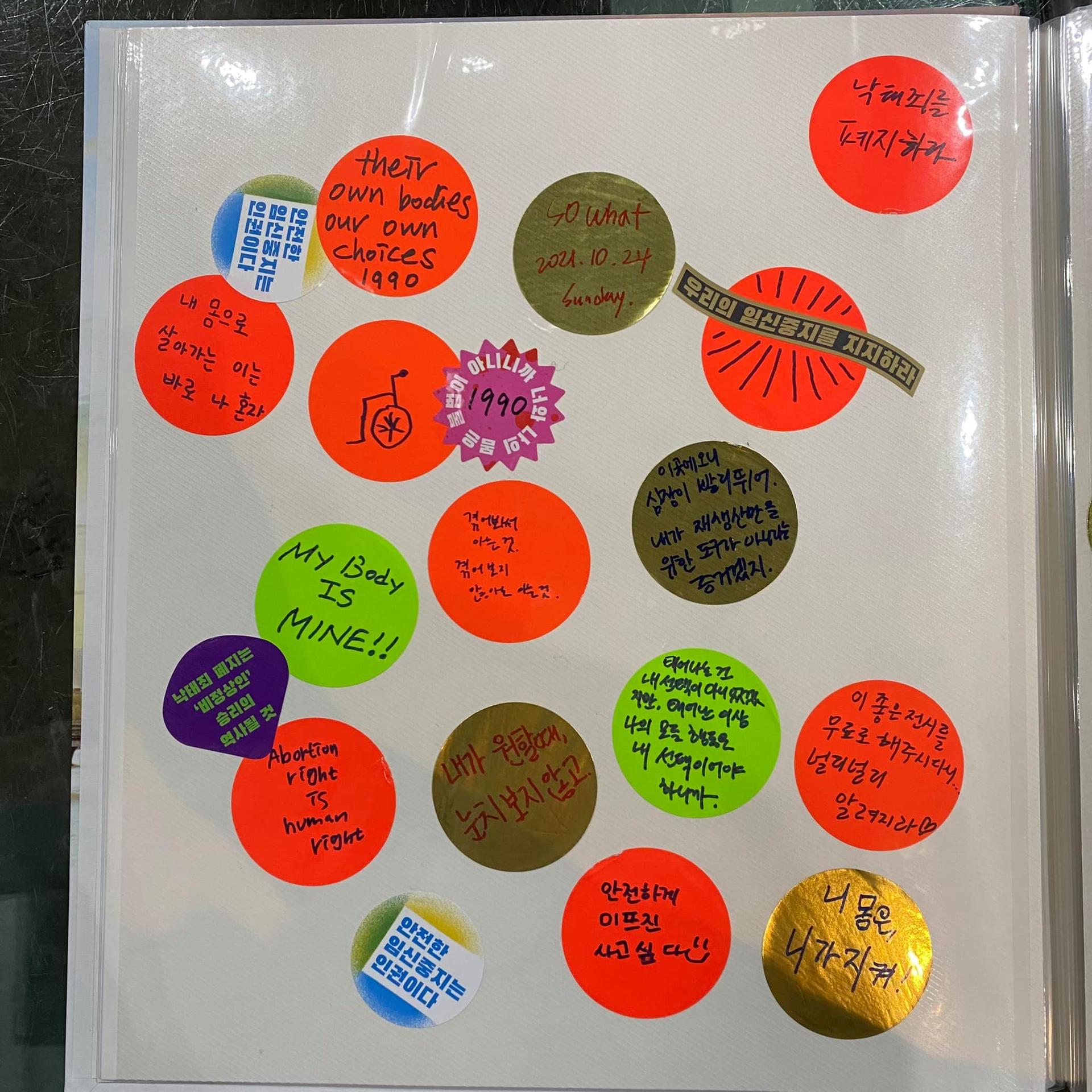 <몸이 선언이 될 때> 전시가 11월 3일에 마무리 되었습니다. 어제는 해체 작업을 하면서 여러분이 셰어의 연표 작업 옆에 남겨주신 스티커를 하나하나 떼어 모두 스크랩 앨범에 옮겨 붙였습니다. 단 한 장도 버리지 않고, 연결된 스티커들은 연결된 모양 그대로 옮겼어요. 이 소중한 기록이 역사로 잘 간진되도록 보관하겠습니다.
