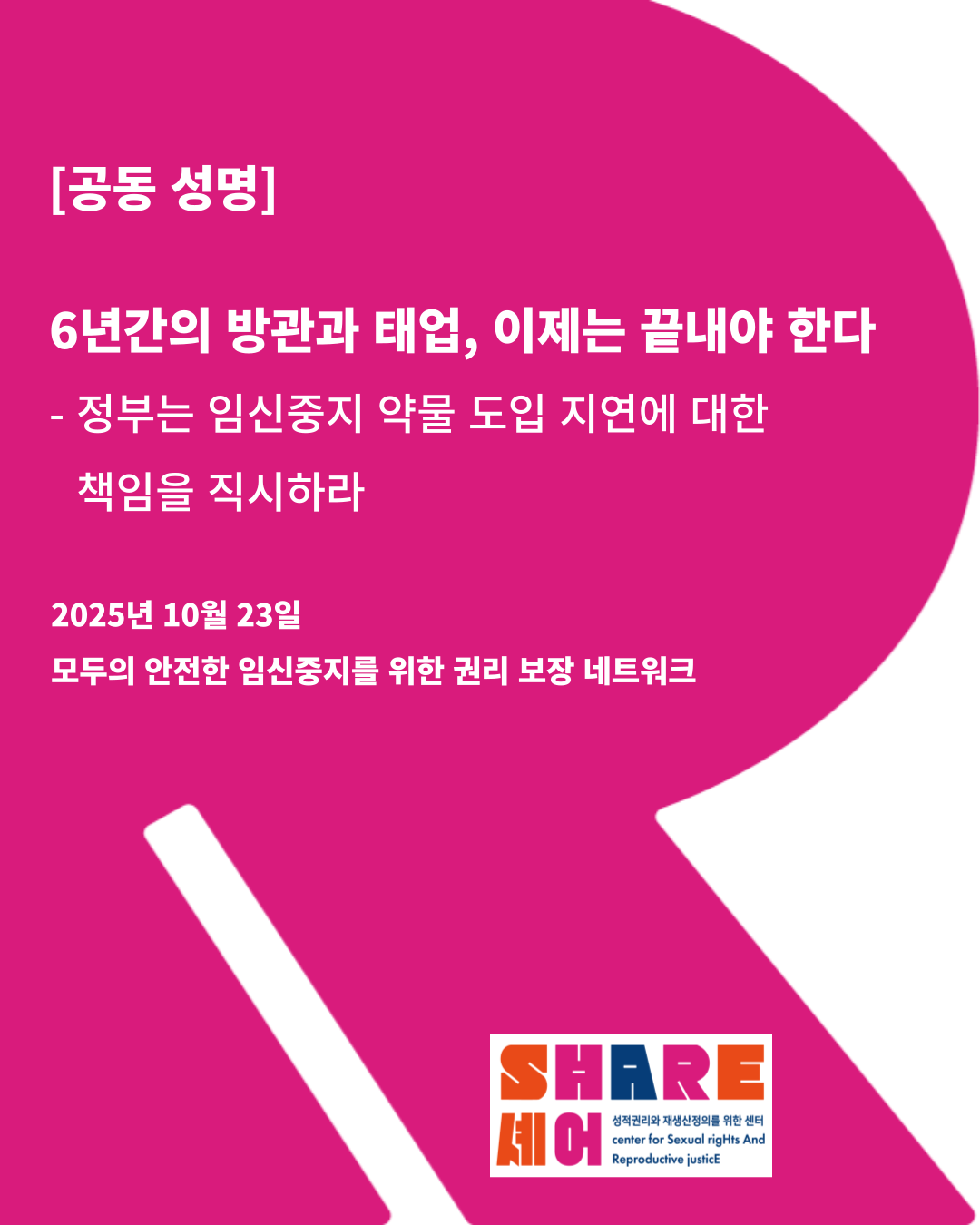 안전한 임신중지를 할 권리는 더 이상 미룰 수 없는 문제다. 보건복지부와 식약처는 임신중지 약물 도입을 지연시킨 책임을 직시하고, 국민의 요구에 응답해야 한다. 더 이상 정치적 태업으로 국민의 건강권을 위협해서는 안 된다. 복지부와 식약처는 즉각 임신중지 약물 도입을 추진하라. 임신중지를 공식적인 의료체계에서 제공할 수 있도록 가이드라인 마련에 나서며, 임신중지 서비스의 건강보험 적용을 서둘러야 한다. 국민은 더 이상 기다릴 수 없다.
